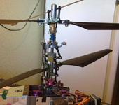 Когда-то это была Walkera 53-1,от неё осталась только рама и кое что по-мелочи.В основном-металл.(Мечта-сделать полностью металлический вертолётик).Апгрейд Art-Tech 370 series.Электроника поменяна на обычную, “классической” архитектуры.Хотел использовать П-образные тяги,да материала не оказалось под рукой.Приколхозил всё,что дома нашёл.На удивление,верт полетел сходу!Я его даже не налаживал,лишь при сборке парные тяги выставил одинаковой длинны.Удивительно то,что он стал стабильнее,а управляемость заметно возросла(похожа на классику,движения стиков-короткие).Перехлёста пока не наблюдал,летаю дома на площадке 2X2 м.Общий вес теперь 520гр,аккум 3S 1300 mA,время полёта-15мин.По субъективным оценкам,верхний ротор имеет примерно 30-40% управляемости по отношению к нижнему.ИМХО:больше,в принципе,и не надо,т.к. плечо силы верхнего ротора к ЦТ верта сильно превосходит плечо силы нижнего.Теперь жду подходящей погоды для полевых испытаний.Потом мыслю прилепить к нему цифромыльницу-что,интересно,получится?