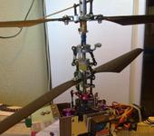 Когда-то это была Walkera 53-1,от неё осталась только рама и кое что по-мелочи.В основном-металл.(Мечта-сделать полностью металлический вертолётик).Апгрейд Art-Tech 370 series.Электроника поменяна на обычную, “классической” архитектуры.Хотел использовать П-образные тяги,да материала не оказалось под рукой.Приколхозил всё,что дома нашёл.На удивление,верт полетел сходу!Я его даже не налаживал,лишь при сборке парные тяги выставил одинаковой длинны.Удивительно то,что он стал стабильнее,а управляемость заметно возросла(похожа на классику,движения стиков-короткие).Перехлёста пока не наблюдал,летаю дома на площадке 2X2 м.Общий вес теперь 520гр,аккум 3S 1300 mA,время полёта-15мин.По субъективным оценкам,верхний ротор имеет примерно 30-40% управляемости по отношению к нижнему.ИМХО:больше,в принципе,и не надо,т.к. плечо силы верхнего ротора к ЦТ верта сильно превосходит плечо силы нижнего.Теперь жду подходящей погоды для полевых испытаний.Потом мыслю прилепить к нему цифромыльницу-что,интересно,получится?
