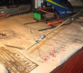 Оперение из потолочного пенопласта. Крепление оперения через скрепки примотанные к балке нитками на клею (да все тут прикреплено на проволке от скрепки на клею). Скрепка изгибается буквой Т и приматывается. Далее стобы закрепить оперение на ней загибаем кончики на 2-3мм в сторону оперения и прихватываем полоской скотча.