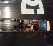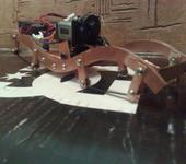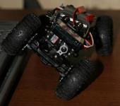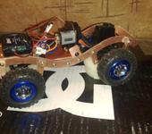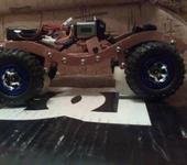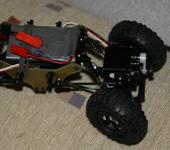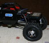 Мной были увеличены рычаги подвески (изготовлены из карбонового прутка), сделана новая легкая рама из миллиметрового текстолита (легче “родной” в два раза) и сдвинуты верхние точки крепления амортизаторов вовнутрь рамы, что здорово улучшило ход подвески. База увеличилась до 132 мм. Оба моста сделаны поворотными. Пружины укорочены на 5 витков и растянуты до 30 мм. Максимально укорочены все провода. В шины засыпаны шарики. Кузов сделан из родного (не пропадать же добру), да и собственно копийный кузов то делать не хотел т.к. это не стендовая модель и положение ЦТ при любом кузове здорово поднимается и происходит КУВЫРК, но супруга и ребенок настояли, “чего это у него провода торчат… и кабины нет, у всех есть , а него нет!”. Кстати, облегчение рамы позволило, без заметных ухудшений ползучести, поместить 1 банку на 850 мАч на верхнюю площадку рамы. Время веселой езды даже с учетом двух серв Hitec-65 MG - минут 40. При полной остановке ползуна (мотор не тянет совсем) напряжение на банке составляет более 3,65 вольт (мотор-отсечка однако). На двух банках ездить не понравилось - уж больно высокая максимальная скорость, а на пульте экспонент то нету, управлять лично мне не очень удобно: хочешь сдвинуться на сантиметр только дотронулся до курка, а он ка-а-а-к ломанется.