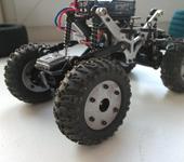 Вот мой лосик с утяжелителями колес. Устойчивость стала лучше, но по прежнему плохо работают амморты. Обрезал пару витков, чуть растягивал до прежней длины, штоки смазывал тефлоновой велосипедной смазкой, все равно даже под новым весом колес не до конца сжимаются. А если кузов еще надеть, то провод от сервы, упираясь в него, мешает левой передней пружине. Пробовал снимать пружины, не понравилось как-то. Родная серва действительно живая еще, хотя куплены с ХК 2 про запас. Оттуда же пришли 2 липохи, спецом выбирал размеры, чтобы влезли в штатное место. На видео видно, что резине не хватает цепка, чтобы забраться по камню, иногда получается с наскока. Сейчас в пути посылка ЕМС с rc4wd, там четыре пары разной резины и диски бедлоки, придет, еще отпишусь.