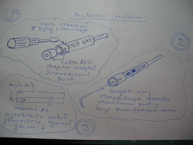 Алексей напиши чуток подробней как удлинить кардан более менее подручными средствами,тк на даче сижу=). Integy. алюминь сбил,установочного винта нет.резьба под него есть…