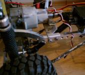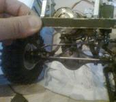 Решено ставить серву на раму, копийно и надежно. Для минимизации подруливаний выбрана наибольшая длина рулевой тяги, с наименьшим возможным наклоном. Серва влезла еле-еле, ничему не мешая. 130 мм аморты, обеспечивающие неестественные хода подвески, демонтированы, поставлены рессоры. Ход немного уменьшился, подруливания тоже, высвободилось место для тяг и сервы сбоку рамы. Подруливания в итоге есть, но малозаметны и не зажимают работы подвески (тут рессоры с большими, чем у тяг, люфтами помогли). И напоследок пару фоток - не понимаю, откуда взялись слухи о плохой артикуляции на рессорах?