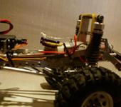 Мотор с коробкой стоит между поперечинами рамы. Сама коробка гораздо длинее редуктора вилли кинга, но все влезло. Правда с рулевой сервой пришлось делать оригинальное решение, с приводом через кардан (на фото он снят). Крепление мотора консольное, держится надежно. Просто так понравилось. Крепление А-тяг к мосту опущено ниже. Раздатка самодельная, отодвинута назад на одно отверстие по штатным креплениям. Результат: до визуально нереальной улучшилась поперечная устойчивость (еще колеса утяжелены по 95 гр). Практически нет карданных эффектов (также валы мостов крутятся в разные стороны).