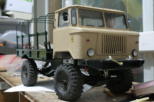 в масштабе 1:10 надо делать ширину по резине, или кабину по аркам, около 200мм. КУНГ 220мм. выбранная резина вполне подходит, ну может чуть широковата.