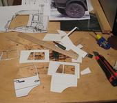 Ну, пока сохнет крыша, решил заняться лобовым стеклом, а точнее, рамкой. Вырезано и склеено на толстом основании: