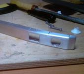 Был взят алюминиевый профиль 20 мм и для создания кривизны, как у оригинала, были сделаны надпилы в полках, потом согнут и проделаны отверстия под буксировочные стрержни и фары. Так как после надпилов конструкця сильно потеряла в жёсткости, Я надставил сверху и снизу текстолитовые пластины, которые скрепил с бампером болтами м2, предварительно подпилив шляпки, для меньшей заметности: