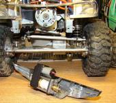 Взял серву усилием 5кг, распотрошил. Выточил вал и штифты 3мм из стали, шпульку из латуни, хотел конешно из Ал ,но под рукой не оказалось. Деталь для привода шпульки из латуни. Получилась вот такая лебедка,намотал шнур 1 мм толщиной ,влезло 4м многовато ,ну да ладно. Крепится к бамперу.