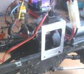После установки переднего бугеля, понял, что аккум не достать, т.к. он вынимался вперёд, а кабина перестала откидываться до конца. Пришлось развернуть акк. отсек наоборот, и сделать его откидным, на петлях. Так даже удобнее стало. Прижимает его кусок пенки, приклееный снизу к капоту. Ну и наклеек чуть поналепил, чтобы лучше ехала;-) Ещё вчера при падении с высокой каменюки вырвало заднюю перегородку кабины, пришлось экстренно заменять её 1,5 мм. дюралевой пластиной.
