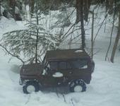 Сегодня покатались. УАЗик едет великолепно. Местами не отличишь от настоящего, превращение в авто со свалки пошло на пользу. Единственный неприятный момент - рулевая серва на раме при полностью вывернутых колесах клинит подвеску, и плавность хода пропадает.