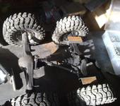 решил сделать ресоры. Не нравятся мне как работают амортизаторы. На подъеме едут только два моста, перед и зад, а средний в воздухе. Взял линейку стальную разрезал на пополам довольно хорошо пружинит. И сверху добавил еще листы только не с линейки, а разобрал рулетку 10метровую там внутри пружина неплохая но тонкая положил по 12листов с каждой стороны. Маятник сделал из поломаного бк двигателя, снял крышки подшипников с подшипниками, снял с вала двигателя постоянный магнит, разрезал вал на пополам вот и готов маятник вроде так называется.