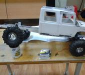 Внемля советам blizzard-а перемерил стоящий недалеко от дома газ 3307 и перепилил капот.Оптика оптикой а искажения имели место быть. Добавил кронштейны буксировочного узла. Крышу очень сильно повело, пришлось срезать и клеить новую. Вывод. Клей Cosmofen Plus хорош для склейки открытых швов но требует времени для сушки при склейке полоскостей площадью 1кв.дм. и более по времени 24-34 часа и желательно под грузом на плоскости.