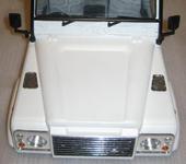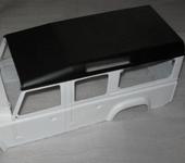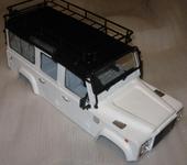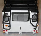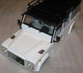 К счастью для фирмы-производителя, фоток кузова ДО покраски не сделал…😉 Кузов красил Паша (Dreik), я наводил потом мелкие детали, красил резиночки и собирал в кучу. Также я сам переделывал салон. Косяки конечно есть, присмотритесь - всё видно, но это увы, “наследство от производителя”, всё что не удалось исправить. Так что совет №1 - если хотите сделать лучше и имеете руки не из …, то лучше (и дешевле!) заказать два 90-х кузова и самому сделать им “трепанацию” и склейку. Даже если не сделаете ровнее - у вас будет 2 салона, что очень пригодится! Окраска - по желанию заказчика. Реально, если для “себя любимого” - нужно красить в нечто более ярко-контрастное, лучше всего в камуфляж. Либо что-то в стиле альпийских горнострелков, либо типа “буря в пустыне”. Тогда все мелкие неровности и косяки незаметны. Краска - матовая (копийно), не вздумайте глянец наводить - все косяки сразу выпрут. Однако, на белую матовую липнет как магнитом всякая грязь - заляпать просто с пол-пинка!. Из-за серого грунта, которым был покрыт кузов спецами RC4WD, пришлось истратить 3 (!) баллона белой краски! Ну и ещё полбаллона чёрной матовой ушло на крышу… И ещё фломастером Тамиевским порисовал резиночки + подкрасить где по-мелочи + белым фломастером спереди лобовое стекло. Лобовое стекло - караул ! - Разводы так и бликуют на свету, кривое до невозможности. Правда, с остальными стёклышками всё в-порядке.