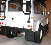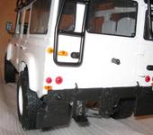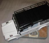 К счастью для фирмы-производителя, фоток кузова ДО покраски не сделал…😉 Кузов красил Паша (Dreik), я наводил потом мелкие детали, красил резиночки и собирал в кучу. Также я сам переделывал салон. Косяки конечно есть, присмотритесь - всё видно, но это увы, “наследство от производителя”, всё что не удалось исправить. Так что совет №1 - если хотите сделать лучше и имеете руки не из …, то лучше (и дешевле!) заказать два 90-х кузова и самому сделать им “трепанацию” и склейку. Даже если не сделаете ровнее - у вас будет 2 салона, что очень пригодится! Окраска - по желанию заказчика. Реально, если для “себя любимого” - нужно красить в нечто более ярко-контрастное, лучше всего в камуфляж. Либо что-то в стиле альпийских горнострелков, либо типа “буря в пустыне”. Тогда все мелкие неровности и косяки незаметны. Краска - матовая (копийно), не вздумайте глянец наводить - все косяки сразу выпрут. Однако, на белую матовую липнет как магнитом всякая грязь - заляпать просто с пол-пинка!. Из-за серого грунта, которым был покрыт кузов спецами RC4WD, пришлось истратить 3 (!) баллона белой краски! Ну и ещё полбаллона чёрной матовой ушло на крышу… И ещё фломастером Тамиевским порисовал резиночки + подкрасить где по-мелочи + белым фломастером спереди лобовое стекло. Лобовое стекло - караул ! - Разводы так и бликуют на свету, кривое до невозможности. Правда, с остальными стёклышками всё в-порядке.