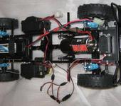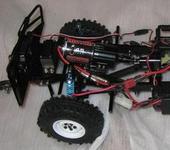 Первой мыслью было вырезать пластину из текстолита по ширине кузова, чтобы уместилась между колёс, и привинтить снизу к балкам шасси. - На ней легко и просто разместить всю электронику. Однако… пластина оказывается на ~5мм ниже кузова, её сильно заметно и она портит весь вид. - Нет, не пойдёт. Крутил и так, и эдак, в конце концов был готов схалтурить - т.е. поставить электронику на “штатные места” - как советуют на сайте. Если можно считать “штатными” местами куда попало приклеивание на 2-й скотч и стяжки. - Но не тут-то было! - Регулятор, установленный поверх сервы оказывается настолько высок, что кузов не садится! Ну ладно бы на 2-3мм, у меня там провода от света могли помешать, но там целых 5-7мм! - Так что всё равно регулятору там не место. Колёсные арки тоже не стоило бы загромождать. В итоге, пришлось сделать так, как видно на фотографиях.
