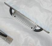 У модели не было порогов. Конечно, можно было бы заказать пороги “от производителя” (реально красивые), да не было уже времени и бюджет нельзя было раздувать. Пороги были сделаны из 2-х ровных пластин аллюминия, 2-х уголков и ещё набора HobbyPro - H521 HobbyPro Side Guard, аналогичные можно найти и под другими брендами. С парой отверстий вышла промашка (но не страшно, прикроются кузовом), потому что Паша неточно сообщил размеры, пока кузов был у него в покраске. Как сделать подобный рисунок? - Секрет прост: Аллюминий протравливается в том же хлорном железе. Т.е. предварительно шлифуем аллюминий (полировать необязательно, при эксплуатации глянец сразу пропадёт) - чтобы просто блестело (это легко сделать бормашинкой с наждаком), наносим рисунок (краской, маркером, и пр…) - в моём случае - наклеиванием узкого (2мм) малярного скотча (тоже продаётся под разными брендами). Почему скотч? - Ровные полосы с ним получаются автоматически и гораздо проще, чем нарисовать. На уголок - рисунок порога, на пластину - просто полосы под углом 45 градусов к горизонту (ну так просто и красиво). Протравливаем … 5-10мин в зависимости от концентрации хлорного железа, промываем, снимаем рисунок. Протравленный аллюминий принимает матовый тёмно-серый оттенок, шлифованные места остаются. При этом появляется рельеф. В-общем, довольно неплохие пороги получились.