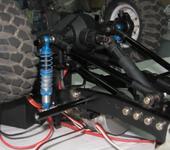 Подвеска оказалась настраиваемая - во-первых, у мостов аксиалла есть “кастер” - это добавляет стабильности на выходе из поворота. Ну и конечно, сделан “сход” на задних колёсах (по-гоночному). Передние получились немного “разведены” - для лучшей поворачиваемости. Фиксированные тяги для заднего моста сделаны из деталей (шары, наконечники) заднеприводной багги Team-C.