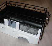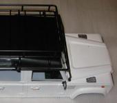 К счастью для фирмы-производителя, фоток кузова ДО покраски не сделал…😉 Кузов красил Паша (Dreik), я наводил потом мелкие детали, красил резиночки и собирал в кучу. Также я сам переделывал салон. Косяки конечно есть, присмотритесь - всё видно, но это увы, “наследство от производителя”, всё что не удалось исправить. Так что совет №1 - если хотите сделать лучше и имеете руки не из …, то лучше (и дешевле!) заказать два 90-х кузова и самому сделать им “трепанацию” и склейку. Даже если не сделаете ровнее - у вас будет 2 салона, что очень пригодится! Окраска - по желанию заказчика. Реально, если для “себя любимого” - нужно красить в нечто более ярко-контрастное, лучше всего в камуфляж. Либо что-то в стиле альпийских горнострелков, либо типа “буря в пустыне”. Тогда все мелкие неровности и косяки незаметны. Краска - матовая (копийно), не вздумайте глянец наводить - все косяки сразу выпрут. Однако, на белую матовую липнет как магнитом всякая грязь - заляпать просто с пол-пинка!. Из-за серого грунта, которым был покрыт кузов спецами RC4WD, пришлось истратить 3 (!) баллона белой краски! Ну и ещё полбаллона чёрной матовой ушло на крышу… И ещё фломастером Тамиевским порисовал резиночки + подкрасить где по-мелочи + белым фломастером спереди лобовое стекло. Лобовое стекло - караул ! - Разводы так и бликуют на свету, кривое до невозможности. Правда, с остальными стёклышками всё в-порядке.