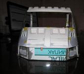 Занимаюсь дальше пластиком. Переделал боковые панели, стали смотреться лучше, первый вариант мне не понравился, да и с оригиналом мало сходства было. Так же боковые панели на морде подогнал, прихватил в нескольких местах для снятия размеров под изготовление капота. Сделал наконец то крышу правда это ещё не окончательный вариант, буду стачивать лоб крыши, слишком уж он резкий получился. В общем клею, шпаклюю, шкурю и снова шпаклюю =)