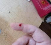 и очередное напоминание о том, что не следует располагать живые манипуляторы в зоне, куда может соскочить при резке нож: