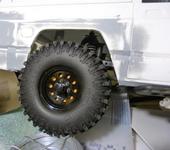 видно, что при использовании зубастой (прикидка на рок крашеры, внешний диаметр 108 мм) резины колеса не влезут в оригинальные арки (зеленые овалы). для более мелкой (dirt grabber или mud trasher) все в порядке.