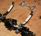 Покумекал, посверлил поточил и все таки сделал. Материал- латунь+ стальная пластина на подошву и фланец. Крюк действующий, собачка на пружинке, которую свил из сестры от шариковой ручки. Рессорный набор из пластин дюралюминия, Между собой склеены каким-то циакрином.Стремянки поставлю позже.
