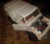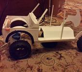ну пока, собственно, модели то и не видно, часть кузова, достаточно коряво сделанного и два колеса… для первого проекта очень высокую планку вы взяли, есть ли какой то опыт в строительстве механизмов? как вы собираетесь делать редуктора, подвеску? проще было бы взять какую нибудь модель и сделать шасси из готовых узлов, а потом уже ваять кузов исходя из габаритов получившегося шасси