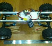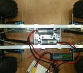При таком положении амортизаторов карданный эффект тебя доконает:). Можно перевернуть коническую шестерню на одном из мостов чтобы карданы могли крутиться в разные стороны, ну и моторчики в нужные стороны.