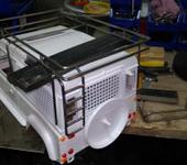 закончил печать креплений багажника (8шт) и креплений “калитки” запаски (3шт). также напечатан корпус для запаски (я хз как он у гряземесов называется, короче где 5 колесо хранится). корпус из 3 частей + пластина черная под надпись. лицевая сторона печатана 3 раза - подбирал вырезы под калитку. средняя часть из АБС. фото с разных ракурсов. сейчас ваяю основу для люстры (4 фары с али готовые) и сетку на багажник