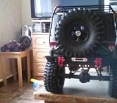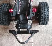 Крышку на мотор сделал из пузырька для таблеток,чтобы грязь не попадала.Бампер передний специально брал такой чтобы за морду не выступал,крепление под лебедку у него есть.Сзади да пустовато, антэнну еще не прикрутил,просятся брызговики но смотреться думаю не будут ,так-как колеса больно из арок выпирают.