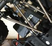 Также пытался увеличить угол поворота колес. В одну сторону мешала качалка, сегодня ее сточил. Кто-то еще винтики ставит впотай, чтобы в них не упирались ?кулаки? колес, но я посмотрел - у меня нет смысла ставить винты впотай т.к. тяги упираются в кулаки под таким углом что головки не мешают - уже мешает корпус.