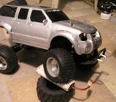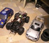 потавил спереди рычаги от багии, сзади немного поработал, поставил 3х редуктор вследствии чего пришлось перенести акбшку назад(мешал мотор), за неимением удлинителей хексов распилил пару дисков и уменьшил им вылет(те что спереди) ну и корпус от ниссан фронтьер вроде, откопал в НЗ)))))))