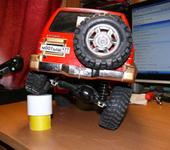 Вот то, что было и что стало (установил на зад более длинные амортизаторы (спасибо Ходакову), передние нижние рычаги слегка пропилены, что позволило увеличить угол между горизонтом и нижним рычагом, кузов спереди поднят путем перевертывания вверх ногами его крепления к шасси, подкрылки передние перенес из под крыла на него. Теперь, надеюсь, большие колеса Mud Thrashers, которые еще не купил, встанут без обрезания кузова.