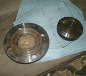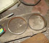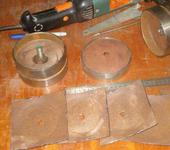 Беру подходящую трубу, у меня Ф 114мм, нарезаю по 30мм, далее работа на токарном. Снимаю внутреннюю фаску 1мм глубиной 5мм, туда вставится диск. Снаружи снимаю углубление 1мм шириной 22мм под бандаж, буртики оставляю по 1.5мм. Ширина обода 25мм. Для дисков из мет. 1.2 нарезаю заготовки, в тисках между двух матриц делаю вогнутость диска, на токарном снимаю лишнее. Собираю прихватываю сваркой. Готово.