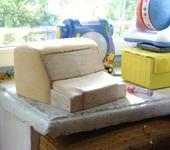 Так как мы не ищем лёгких путей , то решено было делать модель именно с автомобильной кабиной.С начало сделали каркас из фанеры , обклеил пенопластом , самым твёрдым который продавался , обработали до нужного вида и покрыли стекловолокном с эпоксидкой. Фото с необработанным волокном нет , есть только начальный вариант кабины и конечный . Сразу сделал защиту фар и вставил радиаторную решетку.