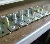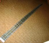 Используются обычные китайские петли для окон и форточек , ширина по пальцу 65 мм. а по самой петле 57мм… Толщина стали 0.5 мм . На две гусянки ушло порядка 200 петель . В упаковке 40 шт. Цена петли 1гривна , для понятности 1 доллар = 8 гривень . Это самые длинные и дорогие гусеницы из всех. Дороговизну сильно нагоняет - гребень. Состоит из винта М4 и заклёпочной гайки . Вещь редкая и дорогая , цена приближается к цене петли. Хоть как то с экономить петли соединял между собой короткими заклёпками. Под заклёпку подкладывал шайбу. На всю ширину петли до пальца сделана проточка под зубья.