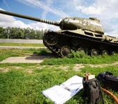 Съездил, посмотрел, обмерил. Впечатлений куча! Рядом с ним почувствовал себя мелким 😃. массивные катки, гусеницы и бышня, огромный корпус, длиннющее 122мм орудие, всё такое внушительное! Залез внутрь и удивился, как там помещалось 4 человека, а ведь почти всё оборудование демонтировано, внутри только орудие, полки для снарядов в нишах, рычаги и пара кресел. КАК люди в нем воевали я не представляю, места в обрез. Надо будет поспрашивать ветеранов танкистов…