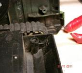 Ленивец, как и опорные катки, намертво прикреплены к корпусу. Они надеваются на пластиковую ось и закрепляются саморезом: