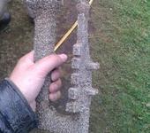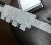 Результаты первой пробной заливки в мелкий кварцевый песок 0-0,63мм местами хорошо просматривается текстура пенопласта, края детали и некоторые буквы на детали. Заливал без вспомогательных каналов верху вниз.