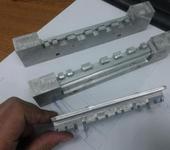 Форма должна состоять из 4 деталей. Первые две это левая и правая половины (этакие расчёски) для формования проушин под пальцы. Третья – нижняя плита (её нет) и формообразующая вафление трака и грунтозацепы на опорных плоскостях трака.
