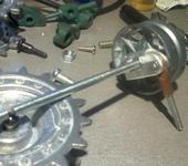 При разметке отверстий в кронштейне (мой из 4 пластин дюраля 2мм толщиной - прочности хватает, а пилить напильником куда легче, чем железо) надо как можно чаще мерять “по месту”. Если расстояние от центральной оси к оси винтовой тяги сделать немного больше - кронштейн начнет тереть гусеницу! А в паре силумин-дюраль (или сталь) первым сотрется конечно силумин.