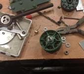 . лобзиком особо ровно не отрезалось, но и не принципиально. Далее просверлил отверстия сверлом 3мм для ленивца, оси и натяжителя