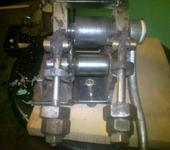 нижние вальцы это подшипники помпы ВАЗ, Верхний самодельный с накаткой. Ручка от мясорубки, металл для корпуса какой был. Отсюда не очень фотогеничный вид регулировки 😃
