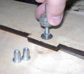Сразу в борта запрессовываем втулки из заклёпочных гаек для опорных катков и ленивцев. Отверстие в фанере делается на 0,2 мм меньше от диаметра гайки.