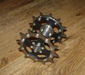 В изготовлении ведущих ни каких особенностей нет. Токарные работы и лазерная резка. Но точно сделать венец можно только после сборки гусеницы. Мне резку металла пришлось заказывать в два захода, с начало гусянка , потом ведущие. Чертёж венца для примерки печатал на бумаги, всё детально проверил, и только потом заказал резку.