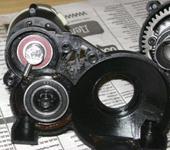 В каждую из половинок корпуса дифференциала устанавливаем планетарные редуктора. Штифт вставляется изнутри, одевается ведущая шестерня на один из валов и потом всё это вместе собирается. Думаю на фотографиях всё будет понятно.