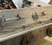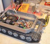 Ходовая - да, беда. Работает не на сжатие, а на отбой. Как следствие - очень сильное и красивое провисание гусениц. Результаты заездов выявили необходимость сильного подтягивания. В итоге подвеска отрабатывает на отбой только половину хода, что не так красиво как хотелось бы. Но… иначе слетают гуси даже просто при развороте на ковре. Сразу было не понятно, но выяснилось, что помимо необходимости установки подшипников в корпус для уменьшения люфтазаодно гуляют и продольные части тележек. Так они изготовлены. С огромными зазорами и почти без запаса прочности. При весе в 10,5 кг при падении с бруствера передка сильно нервничаешь на тему “сколько же еще ударов выдержат тонкие силуминовые кольца продольной части телеги сделанной без амортизации”… 😦