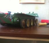 Особенно мудрить не собираюсь на этот раз , так что б ездил чётко , работа немного сдвигается , раскидал оба танка и начал собирать ягу . Так как выключатель и регулятор звука будут установлены в задней части рубки замазал ненужные отверстия в ванне, установил балансиры . Так как краски и грунтовки нет пока то работу останавливаю пока не куплю .