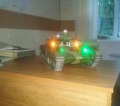 -> если произвести ВЫСТРЕЛ то проигрывается повышенные обороты с движением башни или подъемом опускания ствола и ВЫСТРЕЛ. 0006. mp3 и сервопривод дыммашины переходит на обороты пропорционально оборотов маршевых двигателей (также крутится по часовой стрелке), задние светодиоды (габариты) постоянно светятся вместе с передними светодиодами(габаритами) и фарой -