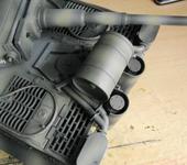 Решил делать сам. Благо опыт в этом есть. На работе выпросил остатки ПВХ, взял “супер-клей” Cosmofen СА12 и сделал точно по размерам. Коробка получилась достаточно легкой и крепкой. Вес 2.2 кг. Внутри вставки из поролона и модель фиксируется четко. От покраски модели осталось немного краски и грунта. Аэрографом запылил в стиле “камуфляж”. Получилось не очень хорошо, но лучше, чем белая коробка. Сделал ремни, для транспортировки на дачу.